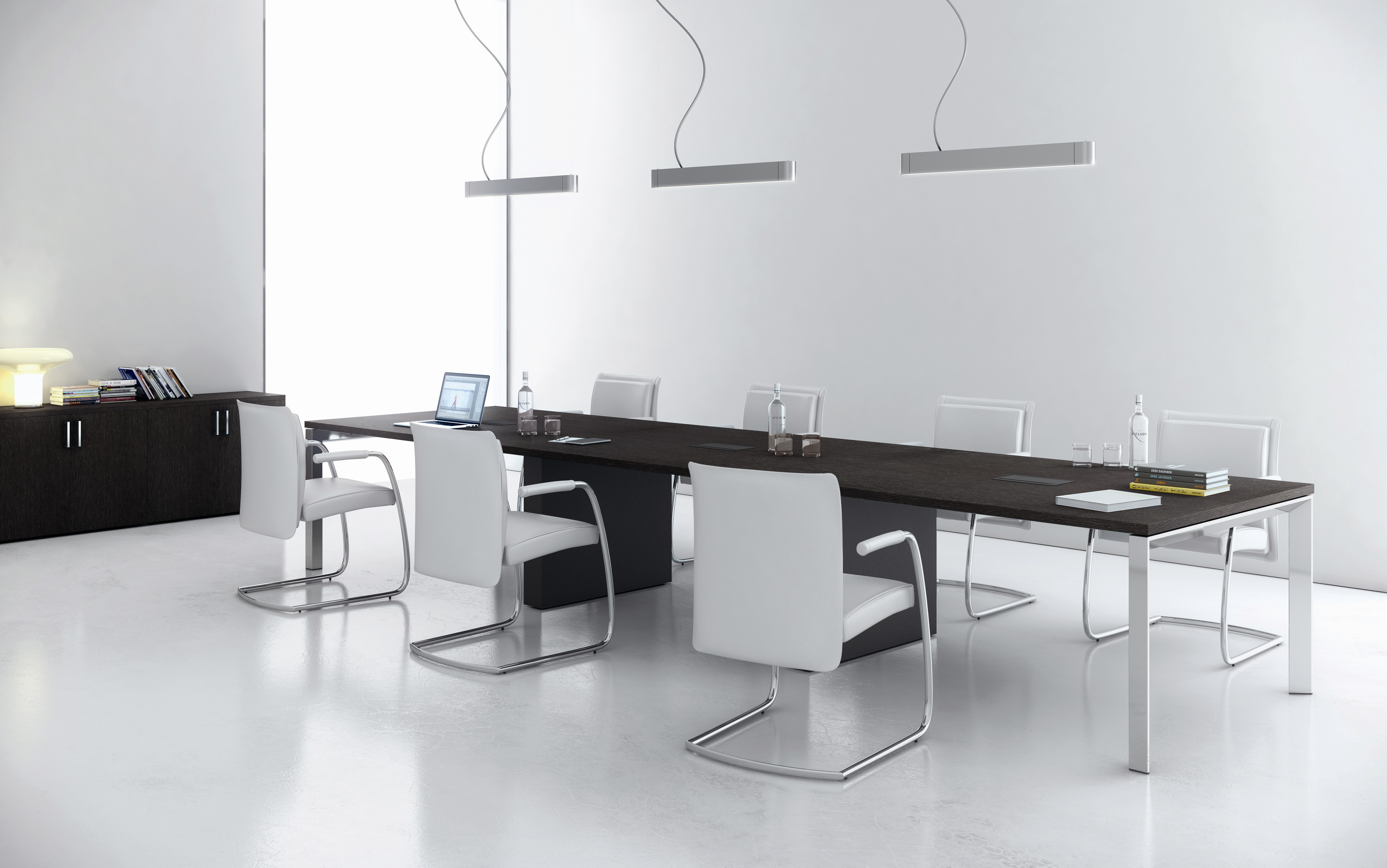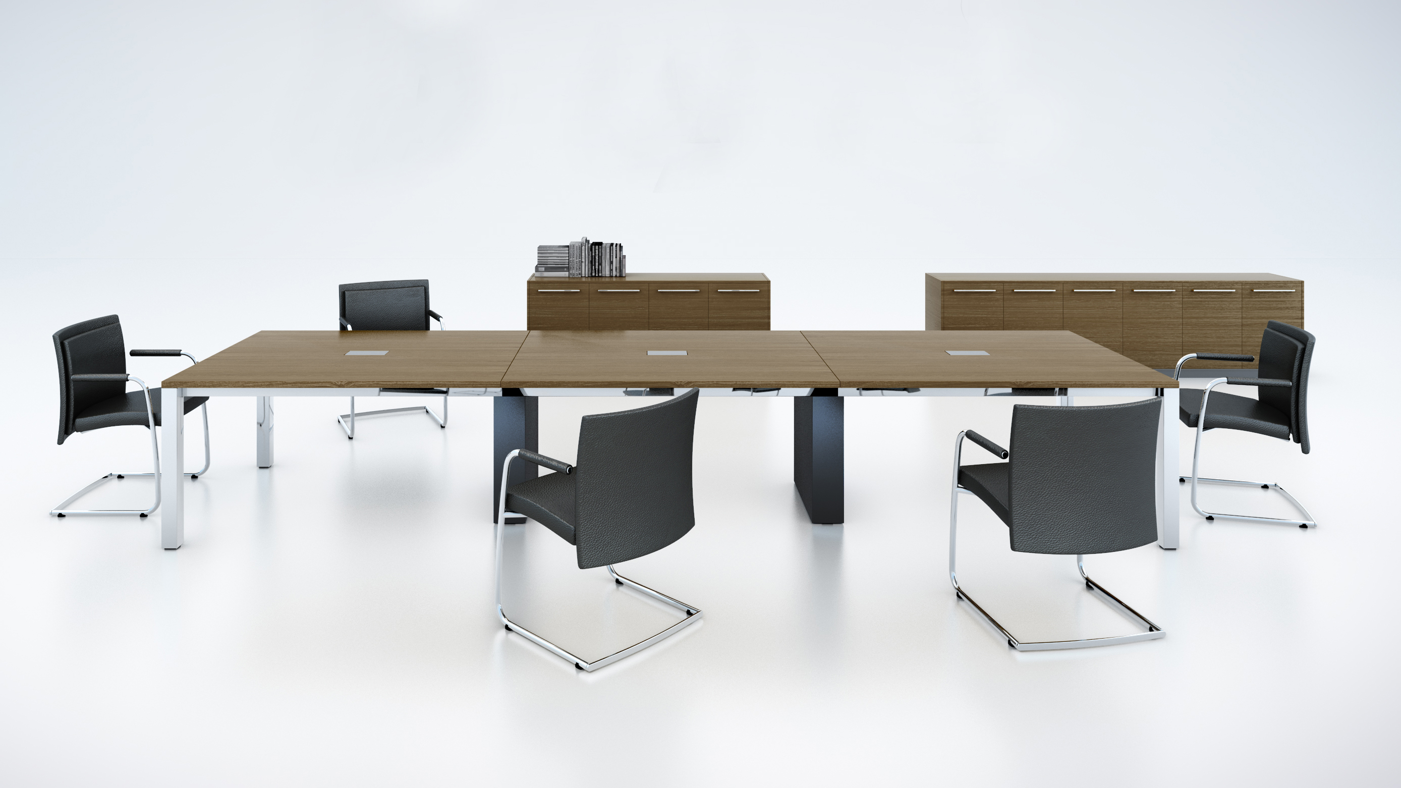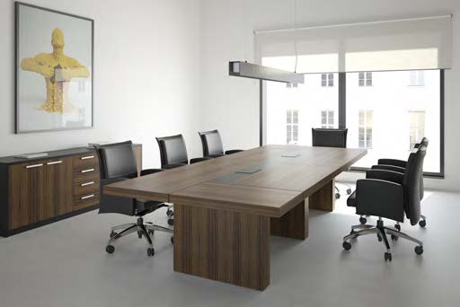 Mesa de conferencias con tablero de MDF de 60 mm/2,4 mm, acabado en laca o chapa de madera natural. Veta de madera en múltiples direcciones.