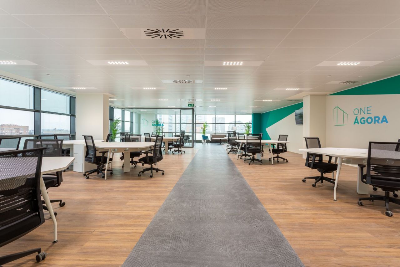 Integra puestos operativos, mesas regulables en altura y áreas de reunión.