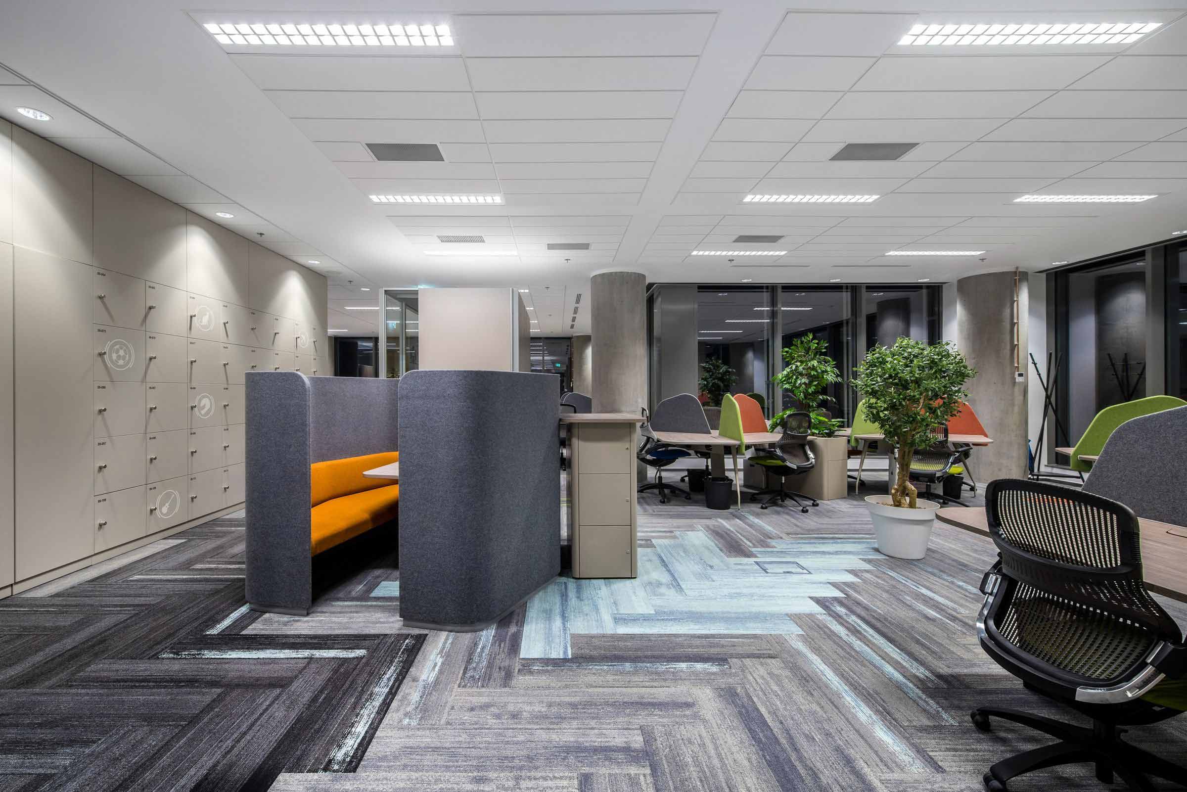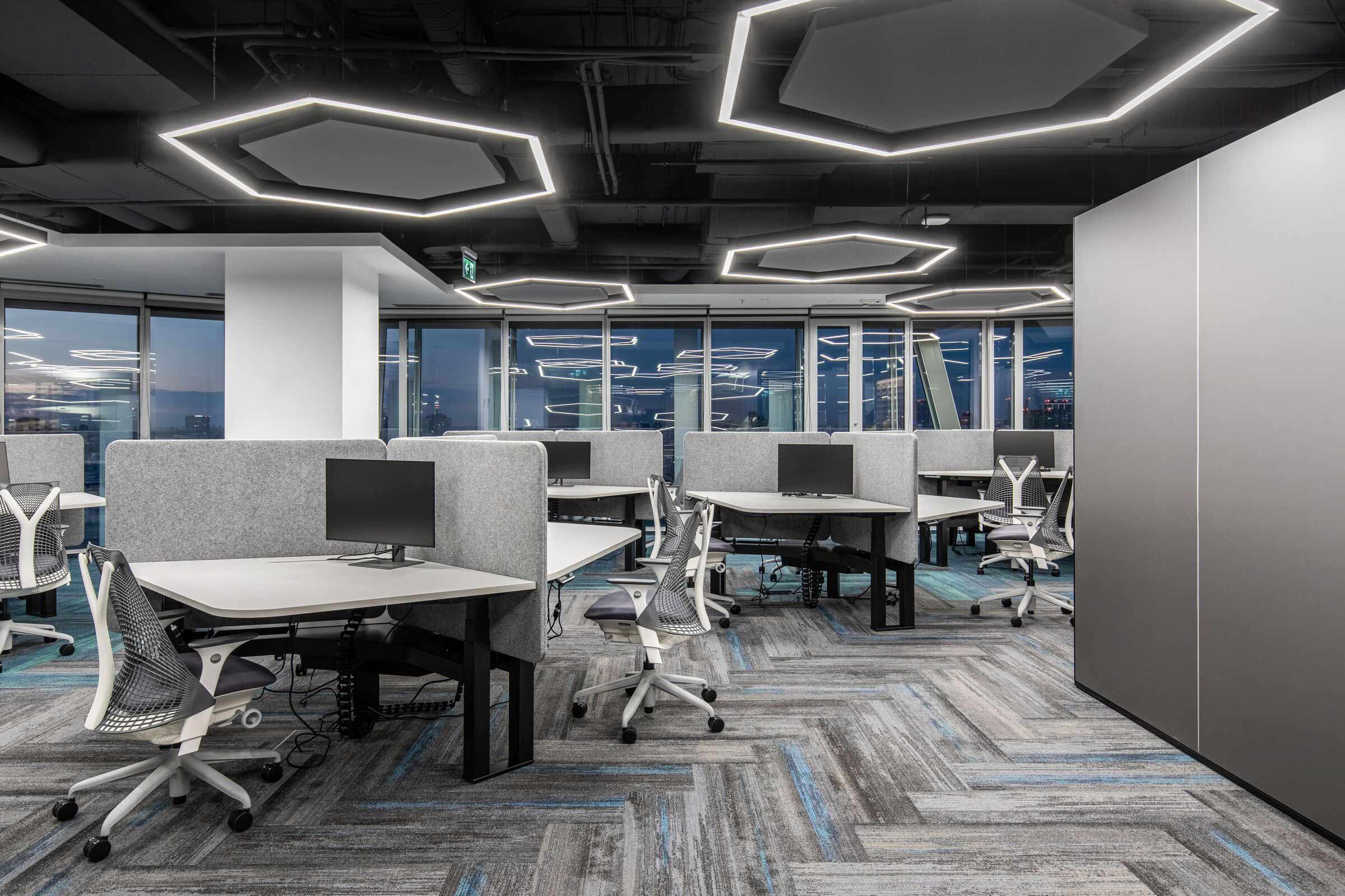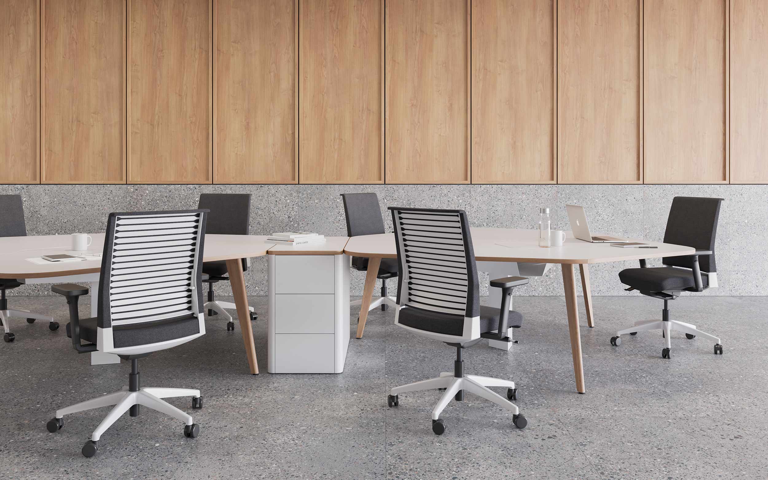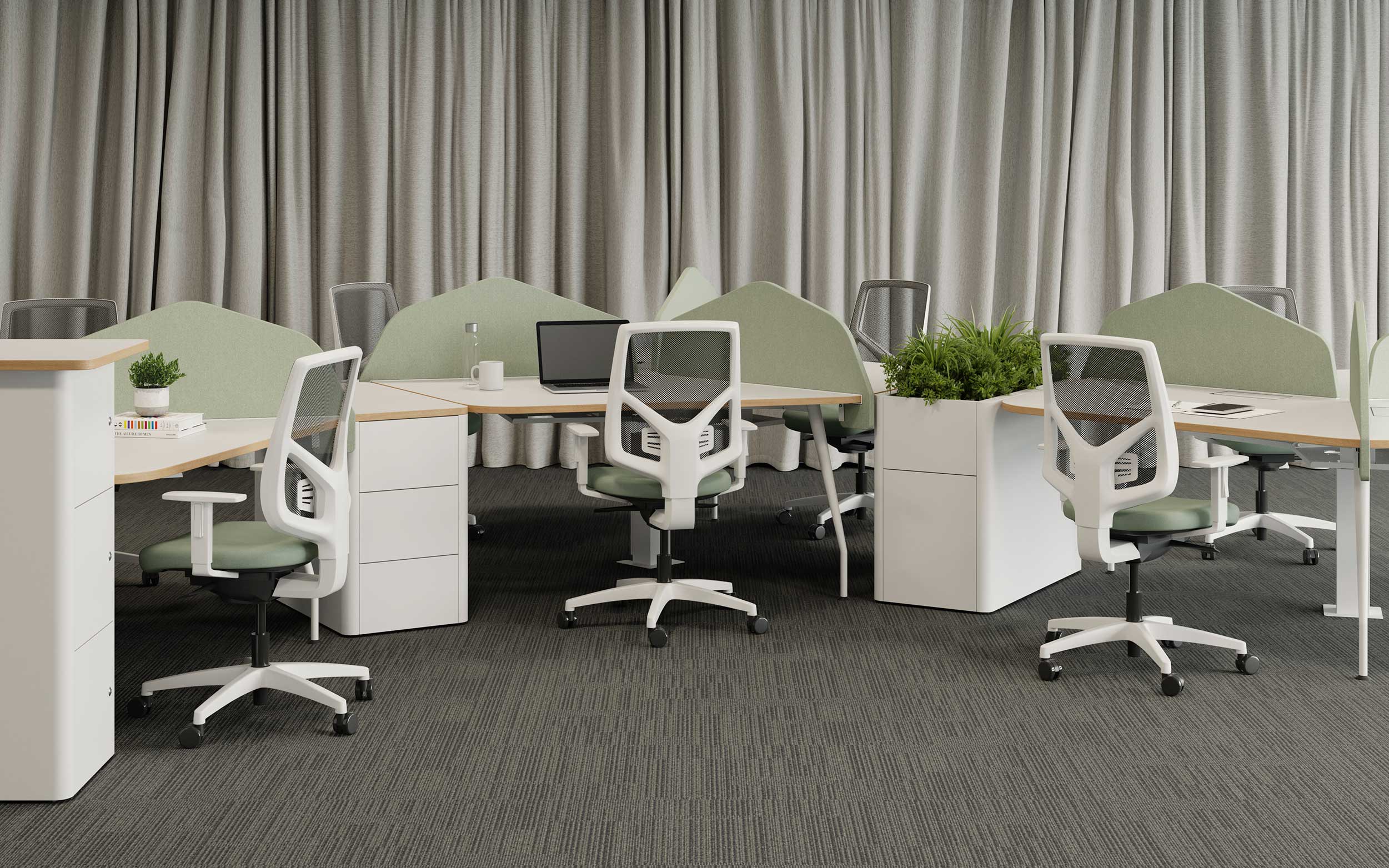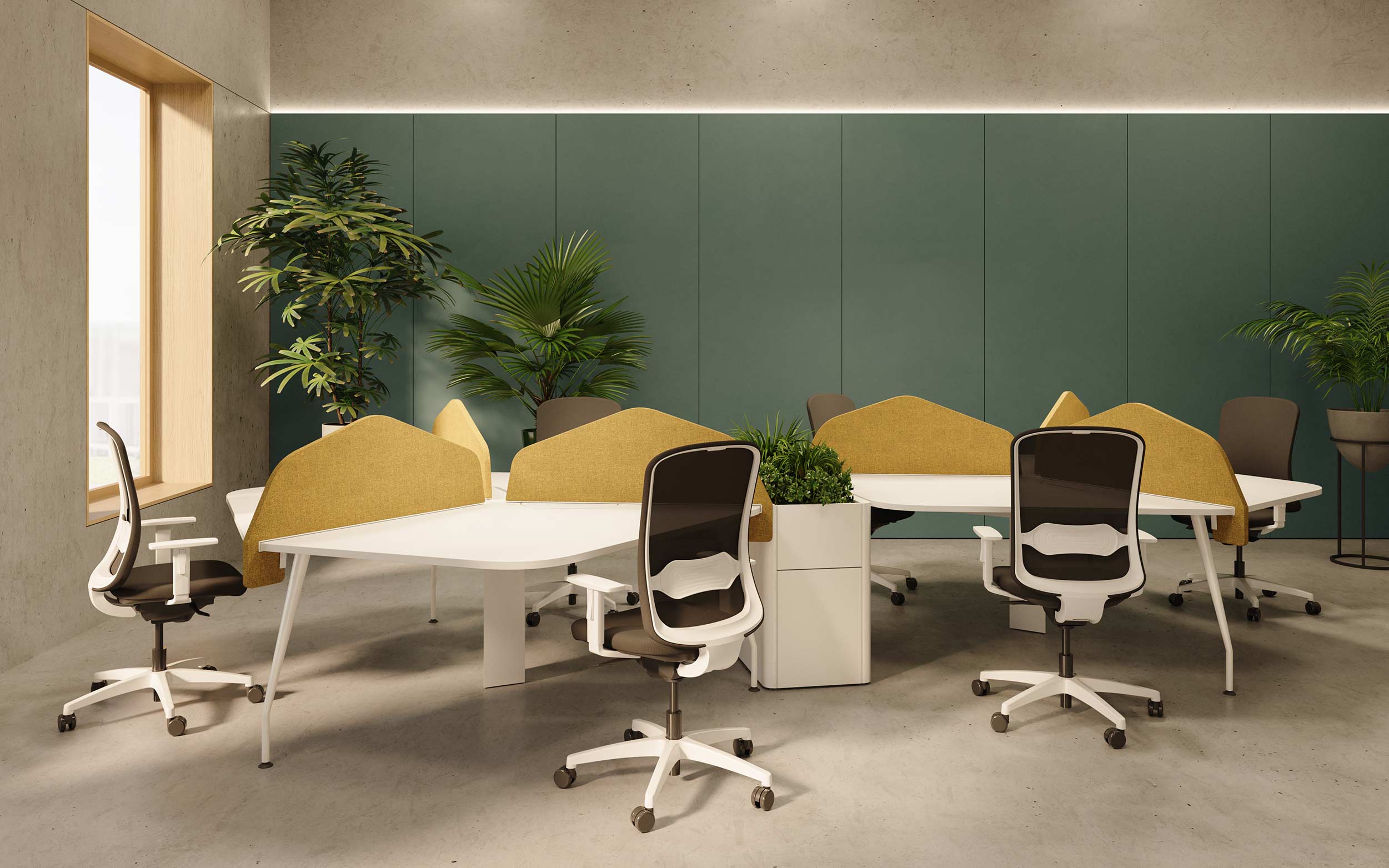 Equilibra colaboración, ergonomía y bienestar en oficinas dinámicas.